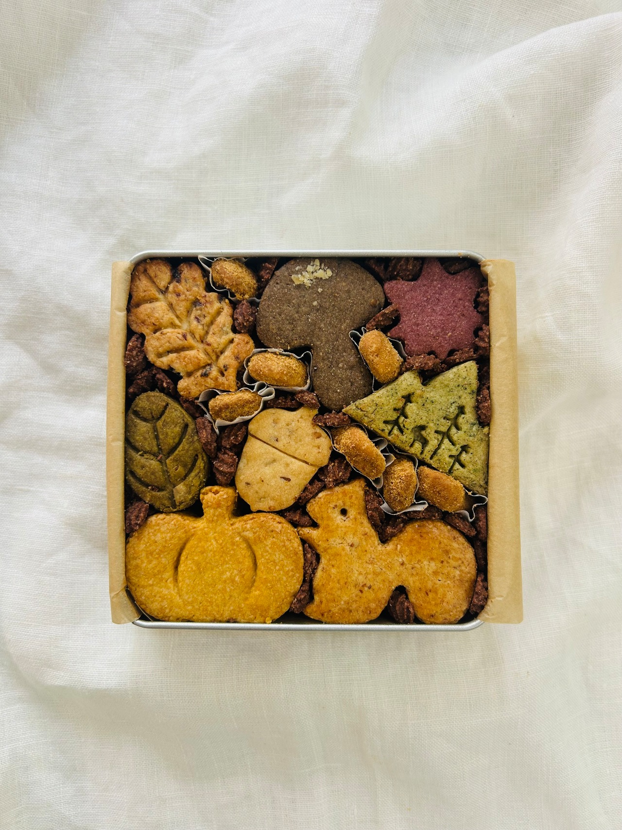 秋の景色をイメージした10種類のクッキーが缶の中いっぱいにぎゅぎゅっと入っています。