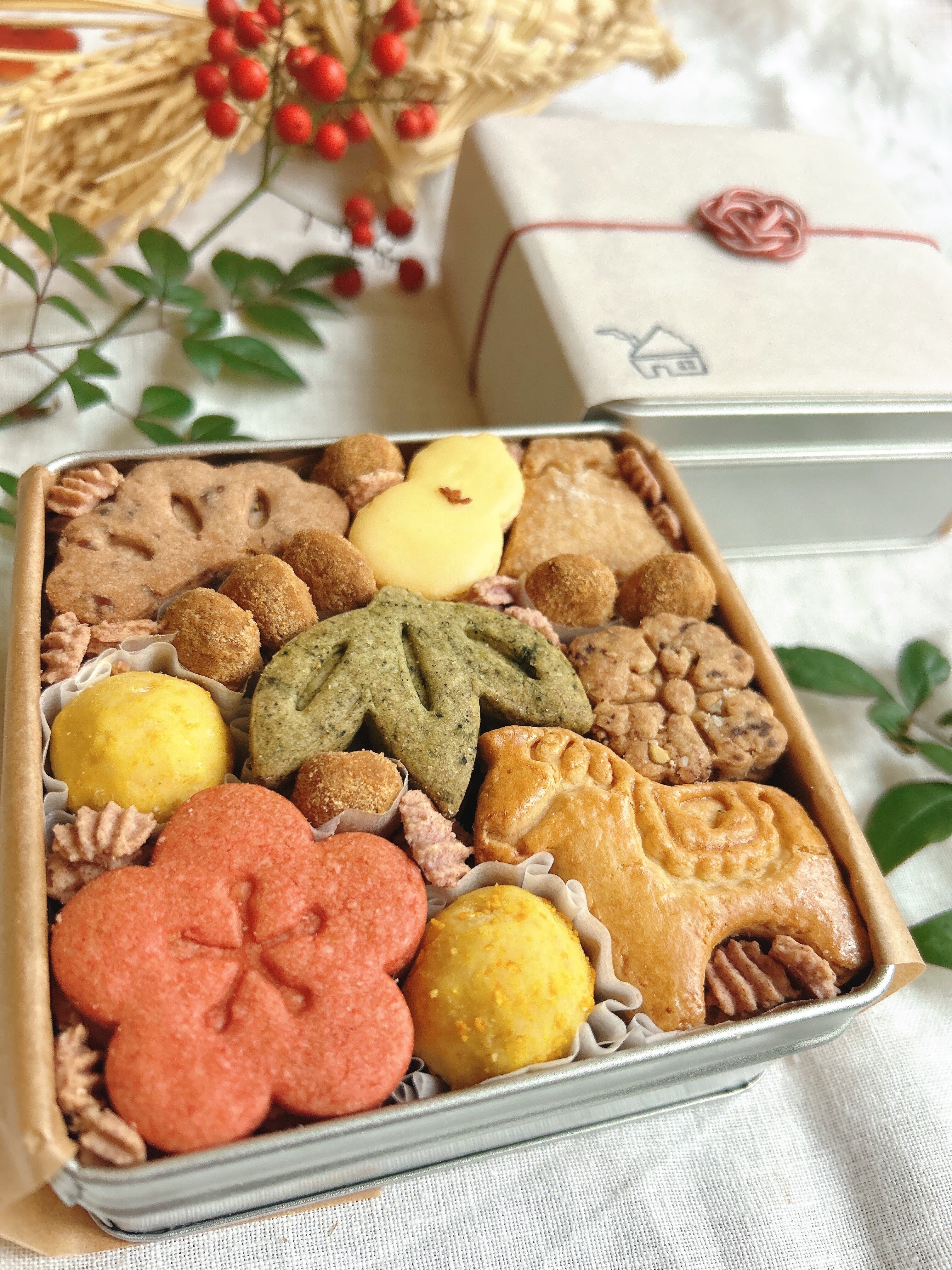 縁起物をテーマに作った10種類のクッキーが缶の中いっぱいにぎゅぎゅっと入っています。